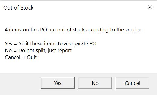 This option compares the Unsent purchase order to the Global Optics warehouse Quantity on Hand and allows the use to split off 0-quantity items to a new PO. There are two prerequisites: the lab must use a vendor code of GL or GO for Global, and DVI must relay the lab's IP address to Global Optics for white-listing.