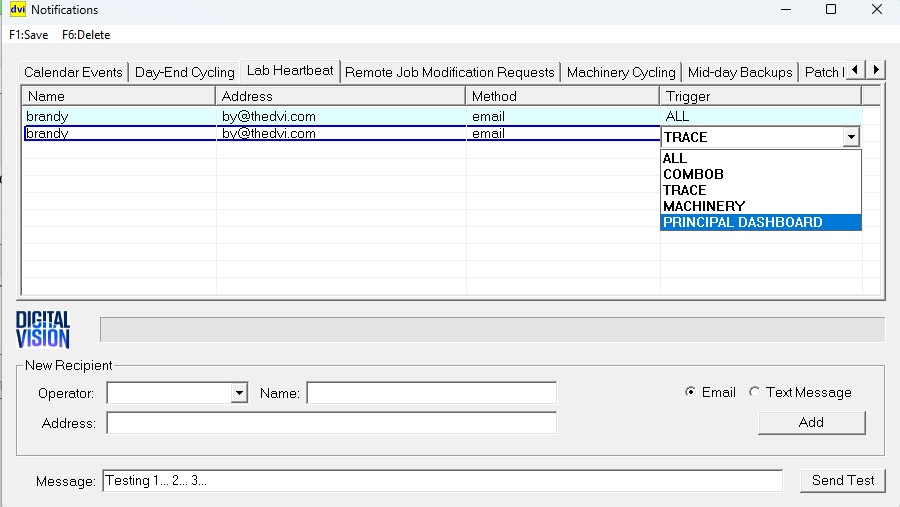 The lab can set up recipients independently for the combobulator, machinery interfaces (on an individual basis), tray monitor, and the principal dashboard in the notifications program. The machinery interfaces also require heartbeat activation in VTM.
