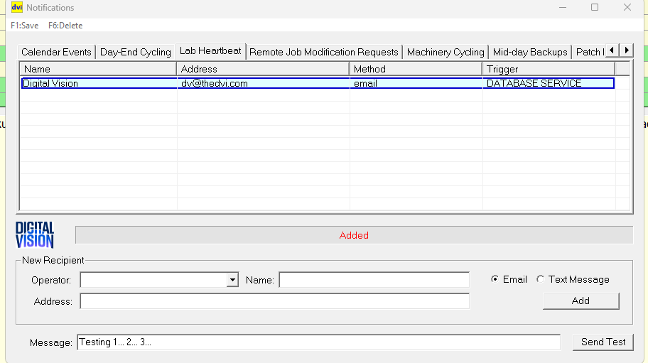 This feature allows the lab to setup recipients to be notified upon database service stall on the server and backup server.